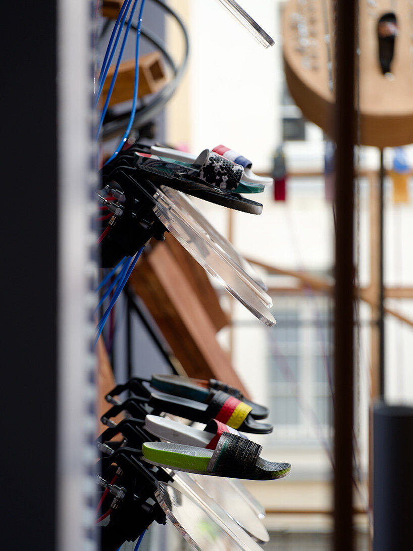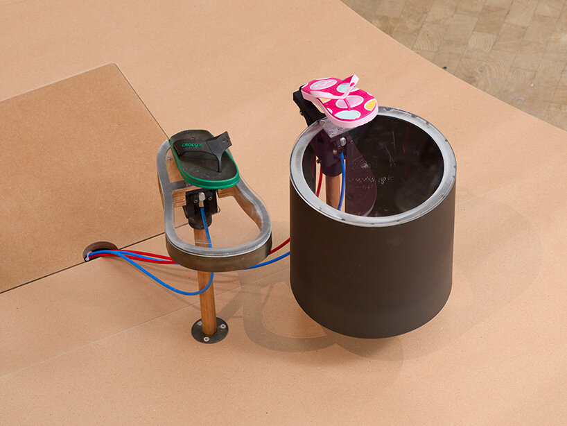 Originally presented at Fondazione Prada in Milan (find designboom’s previous coverage here) and now entirely reimagined for Lafayette Anticipations, Sole Crushing becomes an immense polyphonic instrument. The installation invites visitors to wander through an organic environment of moving percussion instruments, including a sprawling island of sandals that crawl across the floor, vertical ladders and spiral structures covered in shoes, and a massive drum suspended from the top floor, commanding the whole ensemble. Each flip-flop, connected by two air tubes, strikes against materials like wood, plexiglass, fabric, or metal, producing a range of percussive tones that merge into a collective pulse.