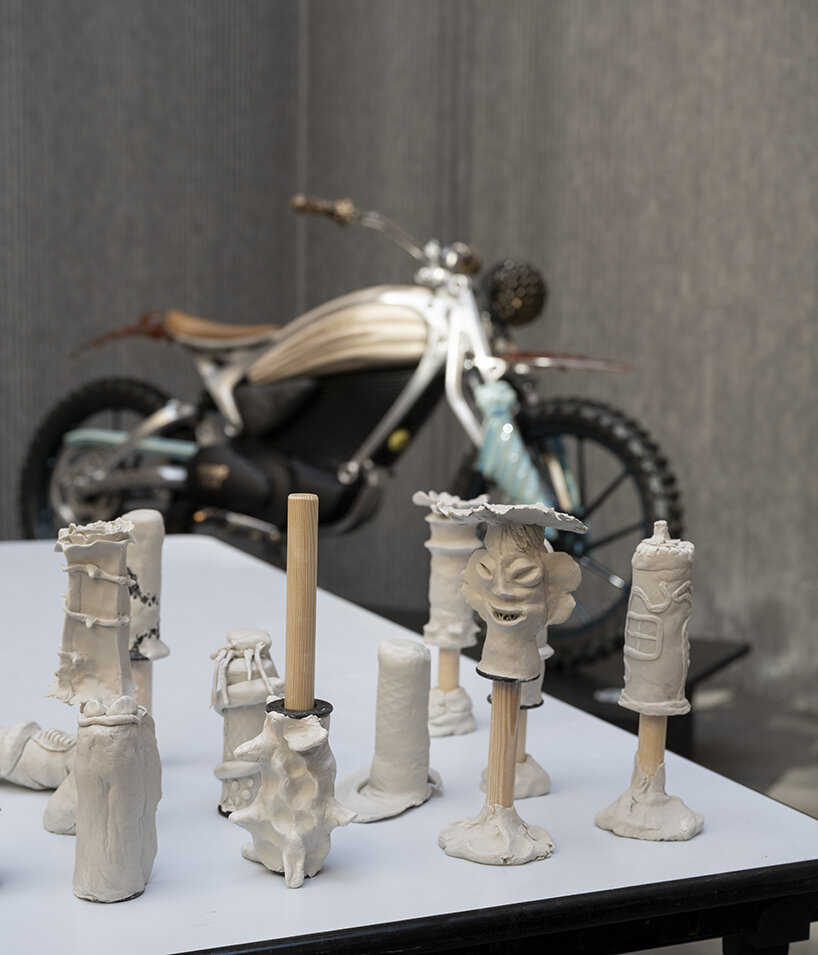 Explaining his process, Mattia Biagi shared during his masterclass: ‘After a specific day on a beach with my wife, I realized I wanted to do a collaboration where I created a crazy motorcycle sculpture. I started to sketch, and that led to my conversation with Flying Flea. We drove back to the basics – the core sensations and universe of bikes – with this artwork.’