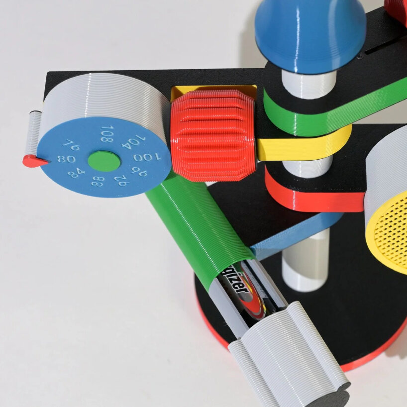 The second limb, the one with a bright yellow grille, is the speaker of the Anomalo FM radio. On its upper left, the third limb, there’s a compass-like dial with numbers imprinted on it. Beside it, a red spinner sits, the control of the dial. These two work together to switch Anomalo FM radio’s frequency. As for the volume of the device, it’s the role of the fourth limb and its red slider. At the top, there’s a blue hat. It holds the body together, and it’s the home to the stowable antenna (yes, the device isn’t wireless, unlike, again, traditional radios).