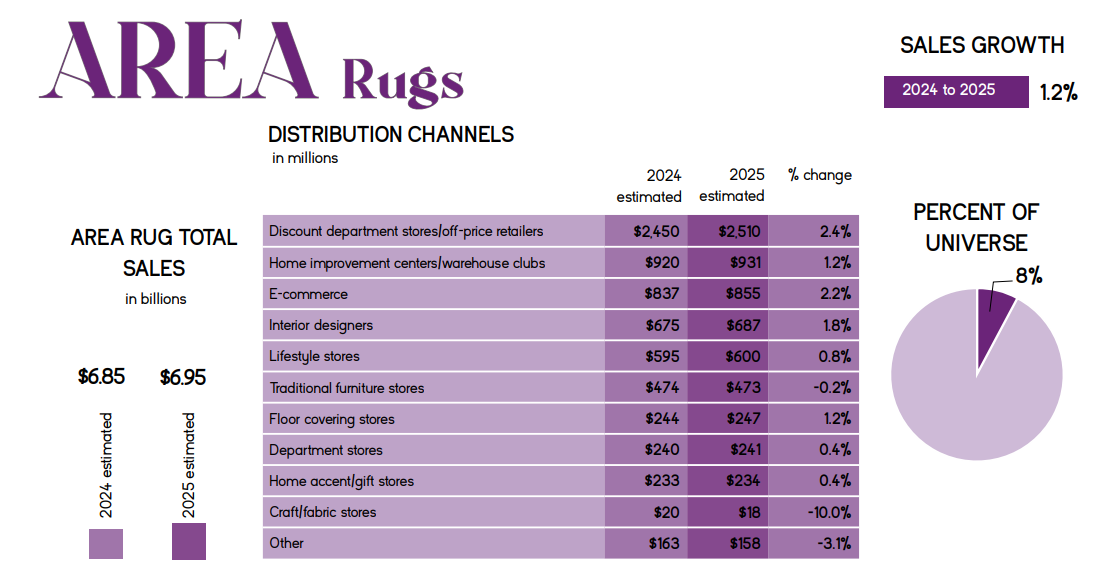 The area rug category, which accounts for 8% of the home accents business, fared much the same as other product categories in a challenging year. Total home accents sales across seven categories are expected to rise to an estimated $86.1 billion this year, up 1.2% over 2024’s $85.06 billion mark, according to the 2025 Universe Report. More information about that report can be found here.
